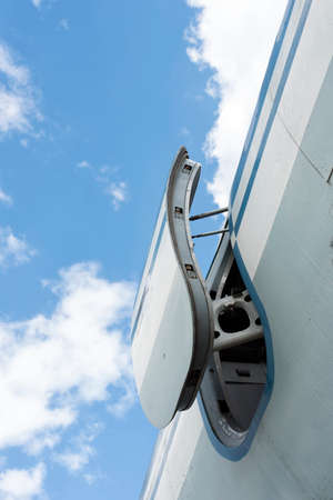 Close-up and high-view shot with beautiful blue sky background of airplane's head part which has been used for flight service for long time showing water stain and rust on the metal surface.