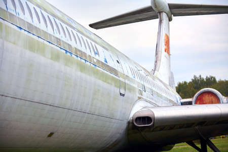 Old passenger airplane out of service and abandoned on the ground.
