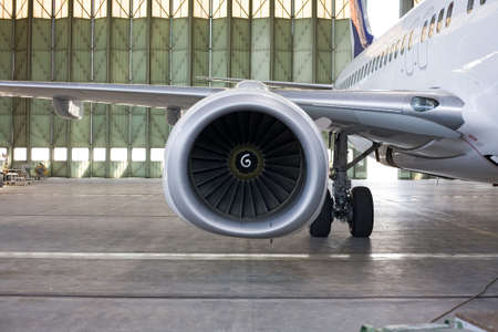 Jet engine at aircraft in the hangar