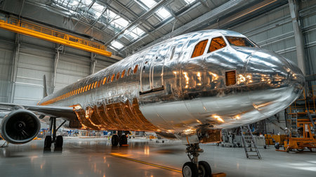Metallic Aircraft Undergoing Assembly in a Large Manufacturing Facility With Advanced Engineering Technology in Progress Generative AI