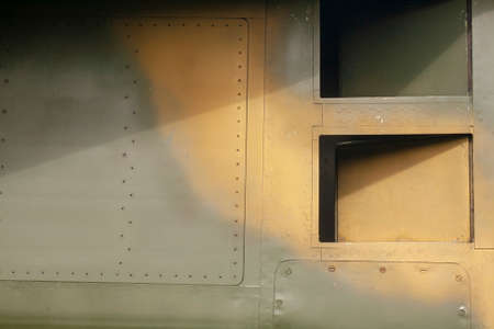 Old metal surface of the fuselage of a military aircraft with khaki rivets. Militaristic background. Air intakes.