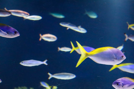Colorful school of fish swimming in tropical coral reef aquarium