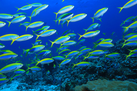 Group of fusilier fish in blue tropical water. School of Doubleline Fusilier ( Pterocaesio digramma ) swimming over rocky reef