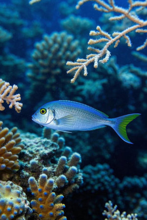 A stunning image of a colorful fish swimming in clear blue waters, representing the vibrant life found in coral reefs and celebrating the beauty of underwater ecosystems.