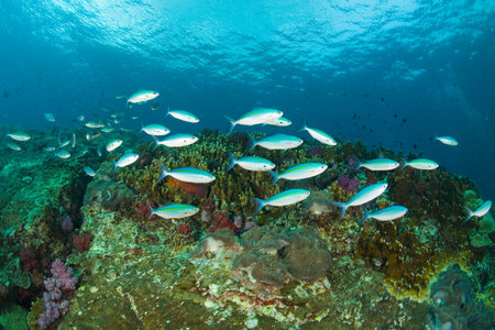 School of fusiliers swimming in blue tropical water