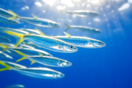 A group of fish swims gracefully through bright blue ocean waters. Sunlight filters down, illuminating the scene as the fish move together in a coordinated manner