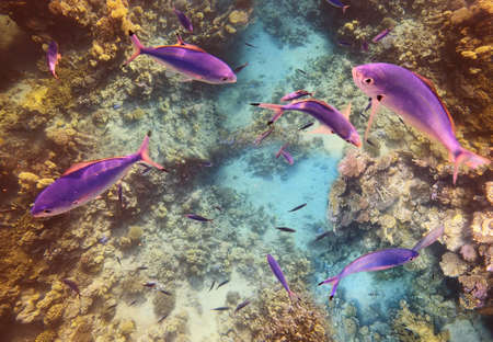 Underwater colorful tropical fishes at coral reef at Red Sea. Blue water in Ras Muhammad National Park in Sinai, Egypt