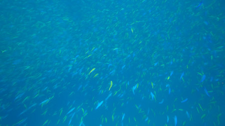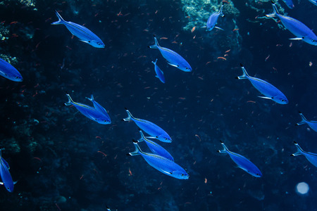 Blue fish shoal underwater in deep sea
