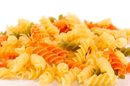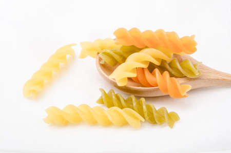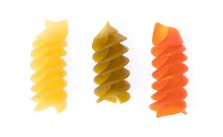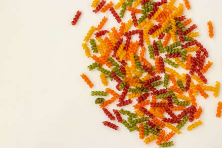 Fusilli multicolored pasta on a white background, horizontal orientation, copy space, top view
