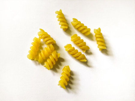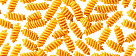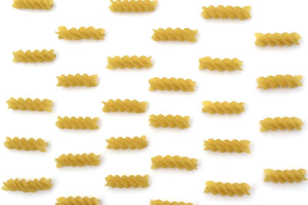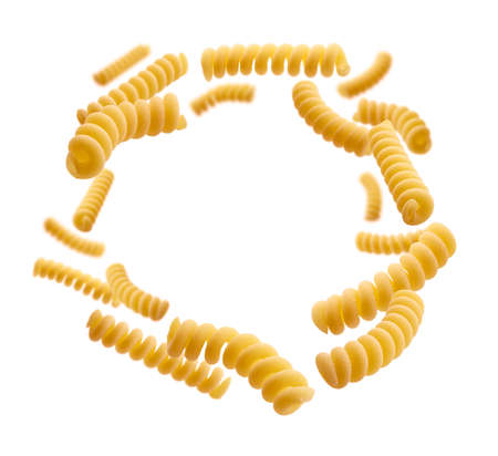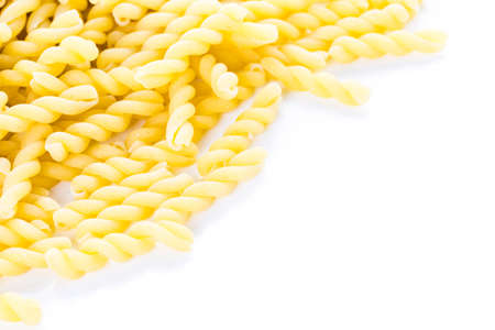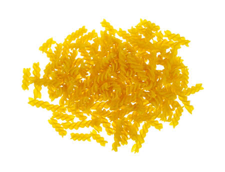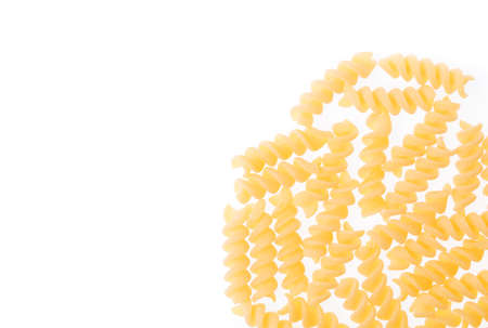 Raw Fusilli pasta, isolated on white background with full depth of field. Italian pasta - Top view with copy space for text. Flat lay