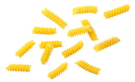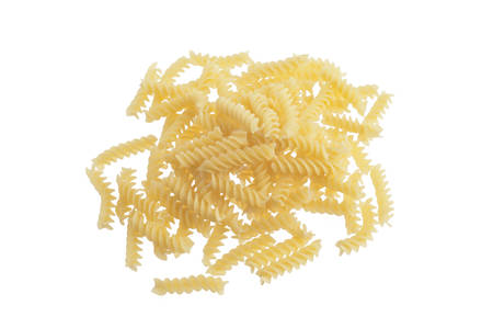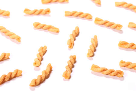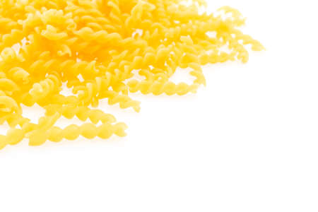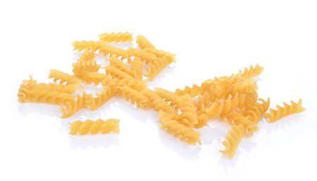 Raw Fusilli pasta, isolated on white background, selective focus. Italian pasta