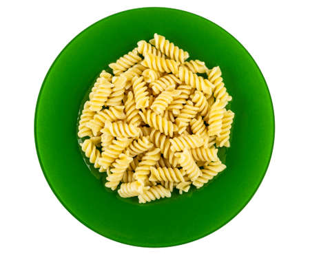 Cooked pasta fusilli in green glass plate isolated on white background. Top view