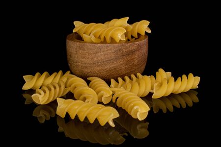 Lot of whole yellow pasta fusilli in bamboo bowl isolated on black glass