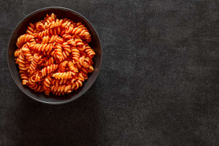 Fusilli, cooked pasta with tomato sauce, on dark background, top view, space to copy text.