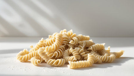 raw pasta scattered on a white background, minimalistic.