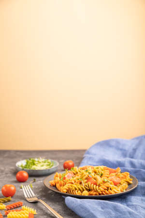 Tortiglioni semolina pasta with tomato and microgreen sprouts on a black and orange background and blue textile. Side view, copy space, selective focus.