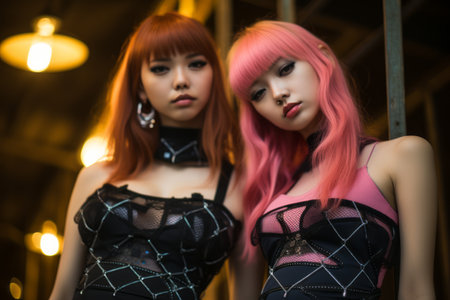 two asian women with pink hair posing for the camera