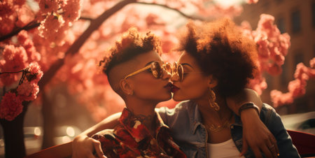 Young African American couple of girls wearing glasses sit on a bench, hugging and kissing under a blooming pink tree in the city. A tender spring moment filled with love, joy