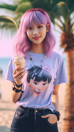 Outdoor portrait of laughing winsome woman in pink tanktop Fashionable girl with colorful hair posing near palm tree : Generative AI