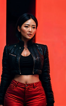 photo of asian woman in jacket outfit with colorful light in background, generative AI