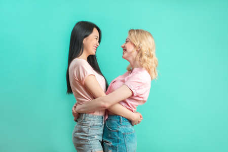 Multiethnic friendship and support concept. Diverse girls, best school friends have not seen for a long time, hugging warmly, happy to see each other over blue studio background with copy space