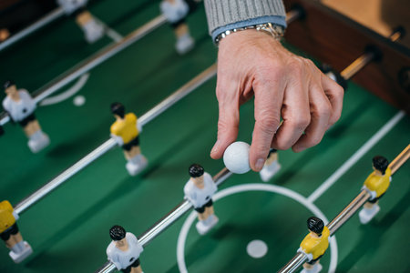 Close-up of players on a table football game (foosball), symbolizing competition, teamwork, and leisure activity.