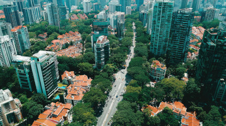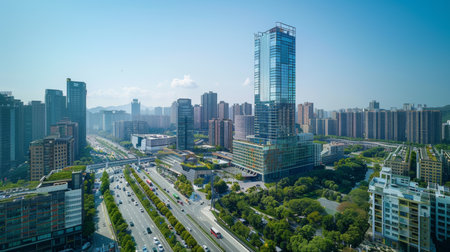 High angle shot of a metropolitan area featuring modern buildings, traffic, and urban greenery under clear skies