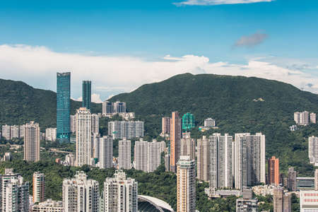 Aerial view of Hong Kong city skyline with skyscrapers and green hills