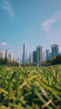a green grass field in the park, with the city skyline in the background, under a clear blue sky on a summer day, using a wide-angle lens to emphasize the vastness of the scene.