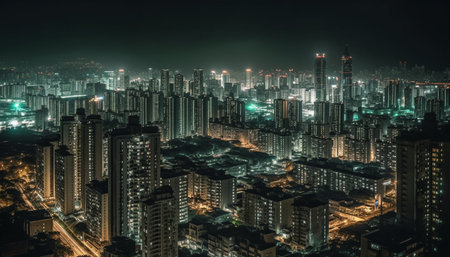 Dense skyline of highrise buildings under vibrant city lights Dec 17 2025