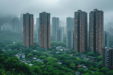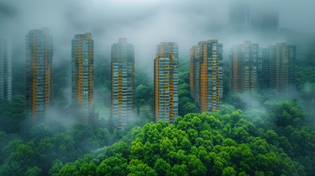An aerial view of a dense forest with tall, modern buildings emerging from the fog. The buildings are a mix of yellow and white, and the fog adds a sense of mystery and intrigue to the scene. The lush green canopy of trees provides a beautiful contrast to the buildings, creating a visually striking image.