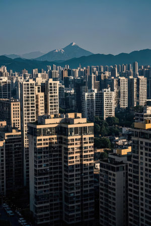 Urban buildings and distant mountain landscapes