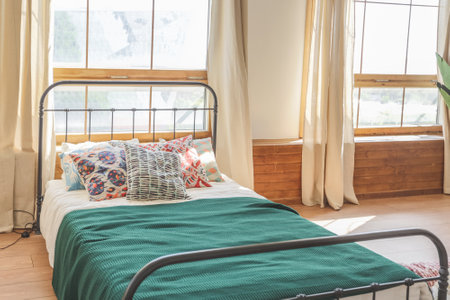 A serene bedroom scene featuring a soft bed near a large window, allowing natural light to illuminate the space, creating a warm and inviting atmosphere perfect for relaxation.
