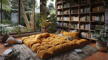 Cozy Home Library with Large Comfortable Sofa and Lush Green View
