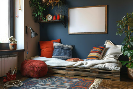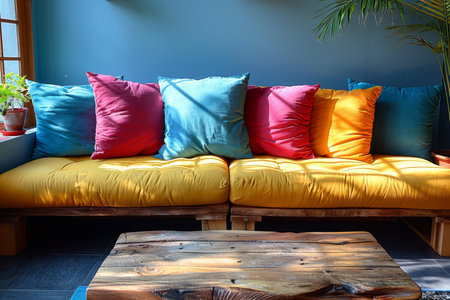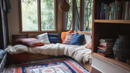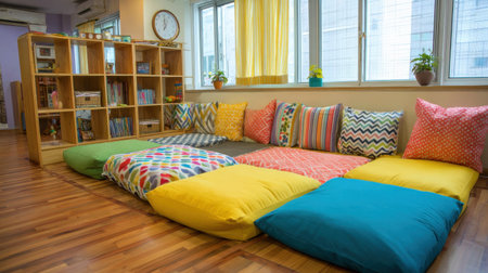 A vibrant seating area designed for comfort and relaxation, featuring colorful cushions and soft textiles, perfect for a cozy indoor space with natural light.