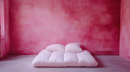 A serene minimalist bedroom showcasing soft pink walls and white bedding, perfect for modern decor. Ideal for creating a calming atmosphere in any home.