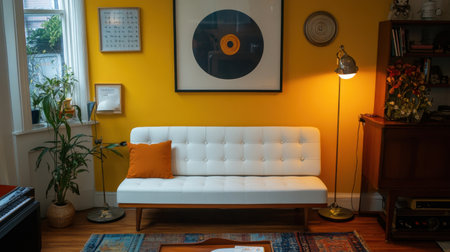 A beautifully arranged living room featuring a modern white sofa, vibrant yellow wall, and artistic decor creates a cozy atmosphere ideal for inspiration.