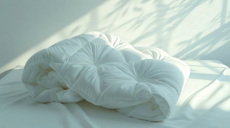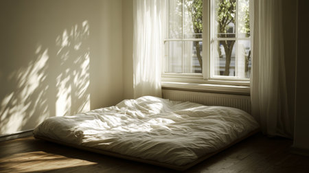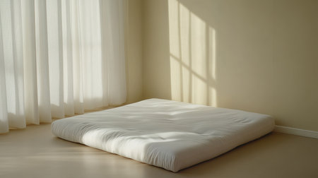 This image features a cozy white mattress resting on a clean floor in a bright and elegantly designed room. Soft natural light enhances the serene atmosphere, perfect for relaxation.