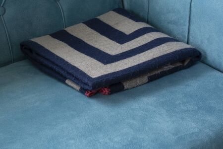 Cushions and plaid on the beige sofa close up with copy space. Sweet home and cozy concept. Indoors