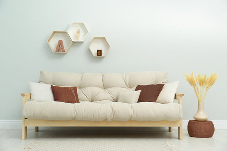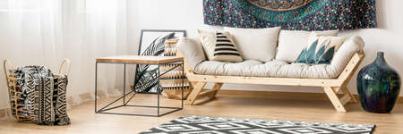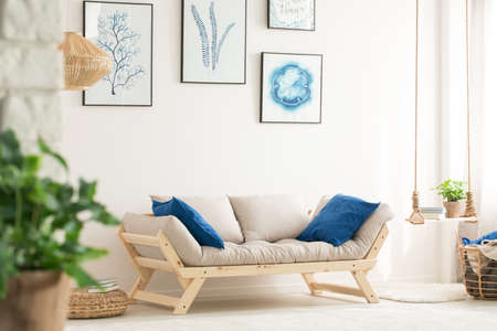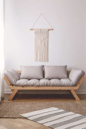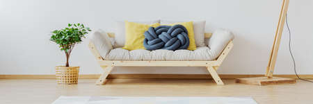 Beige wooden couch with pillows in simple white living room interior with rug and decor. Real photo