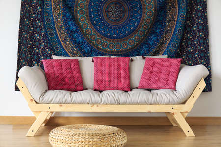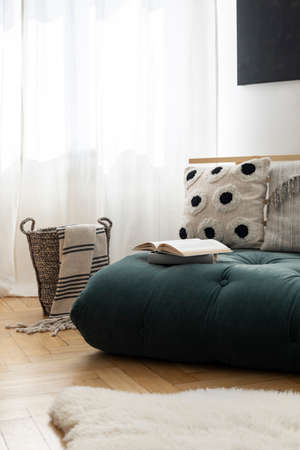 Patterned cushions on green futon in bright living room interior with blanket in the basket. Real photo