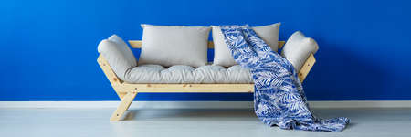 Modern interior design, home comfort and decor, white sofa with pillows in the living room against the wall on the floor in blue tones.