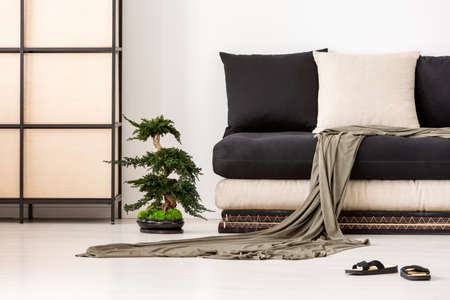 Blanket and pillows on black couch in asian living room interior with shoes and bonsai. Real photo