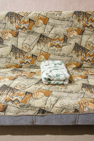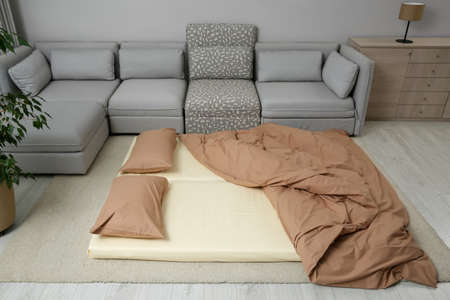 Mattress with pillows and blanket on floor near sofa. Additional sleep place for guest