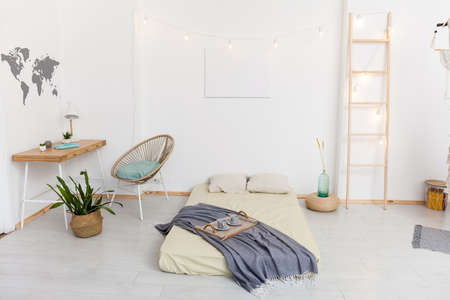 Scandinavian minimalist bedroom interiors with neutral tones, minimal furniture and copyspace for text