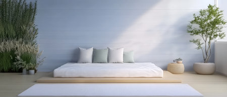 A serene room features a low-profile bed with soft pillows surrounded by indoor plants. Natural light streams in enhancing the calming ambiance of the minimalist design.