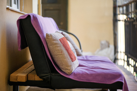 Big sofa on balcony with decorative pillows. Concept of relaxing and resting. Damaged wall in the background. House needs to be renovated.