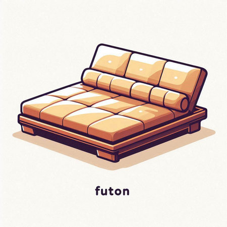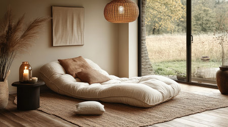 A serene bedroom featuring a cozy futon and soft bedding, adorned with minimal decor elements. Natural light illuminates the inviting space, ideal for relaxation.