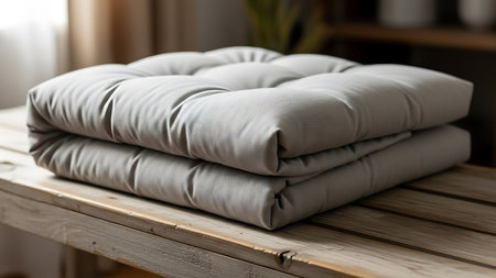 The image depicts two gray cushions neatly stacked on top of each other on a wooden surface. The cushions have a tufted design and appear to be made of a soft, comfortable material. The wooden surface beneath them has a natural, rustic finish. The background is blurred, suggesting a cozy, indoor setting.