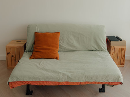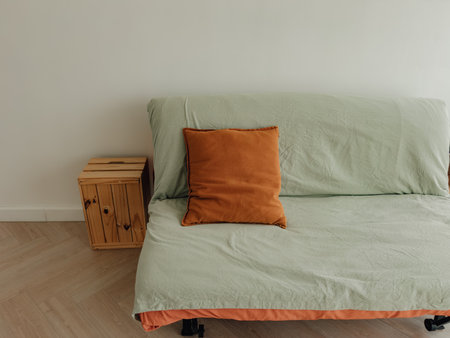 Green folding sofa bed with brown pillow in cozy living apartment.